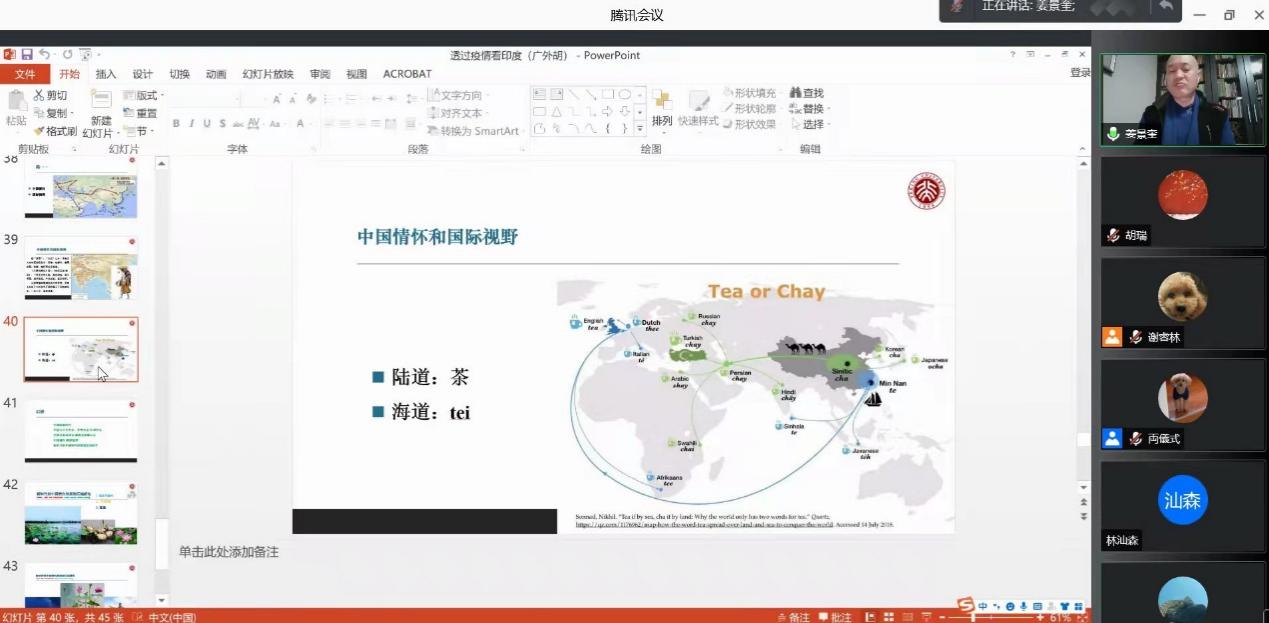 姜教授首先结合具体数据和图片向师生们介绍了印度疫情现状,进而深入分析了其背后的社会历史及文化背景,结合时政解读了印度政府、社会及民众对于疫情的反应,强调印度民族在疫情中的种种反应均与其宗教、社会文化背景息息相关,中国学者、媒体应以正确的态度看待印度社会及文化。姜教授指出,中印文化相互影响,也相互滋养,双边关系与文化交流正如“泥和水”的关系密不可分,而中印两国的友好发展也应建立在理解和接纳对方文化的基础之上,我们应正确理解“构建人类命运共同体”的意义,怀揣中国情怀和国际视野