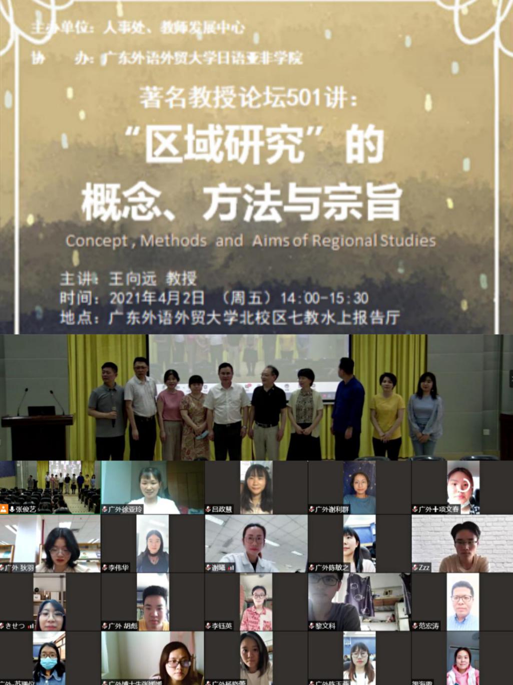 4月2日,由人事处、教师发展中心主办、广东外语外贸大学日语亚非学院协办的著名教授论坛第501讲“‘区域研究’的概念、方法与宗旨”以线上线下结合的方式在广东外语外贸大学北校区七教水上报告厅及腾讯会议同时举办。本次讲座邀请了广东外语外贸大学东方学研究院学术院长、博士生导师王向远教授作为主讲人。广东外语外贸大学日语亚非学院院长陈多友教授,副院长张秀强教授,副院长张志刚教授以及来自我校及全国各大高校的共200余名师生出席了本次讲座。本次讲座由日语亚非学院社会文化系主任程亮副教授主持。