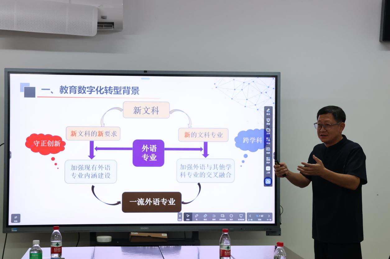 在教学研讨沙龙上,院长全永根教授从教育数字化转型背景、课程建设的各种项目介绍和项目申请经验分享共三个方面对一流课程建设,做题为“外语类一流课程建设项目申报经验”的探讨交流。他认为,当前我国正处于教育数字化转型背景,在科技进步、国家政策推进以及教育发展需求等多方面的需求下,教育领域需要进行数字化转型,以适应数字时代的挑战和机遇。在此背景下,外语专业要根据实际确立特色发展,课程要进行数字化转型,进而推动外语专业与数字的交叉融合。他提出,课程建设是每个老师的首要任务,国家重视一流课程建设,高校教师可以利用相关政策推进一流课程建设。