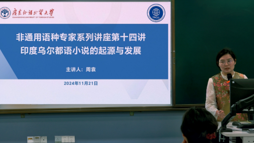 2024年11月21日,北京外国语大学亚洲学院乌尔都语讲师周袁应邀为广外师生作主题为“印度乌尔都语小说的起源和发展”的讲座。讲座由广东外语外贸大学人力资源部(教师发展中心)主办,非通用语种教学与研究中心与亚非语言文化学院承办。