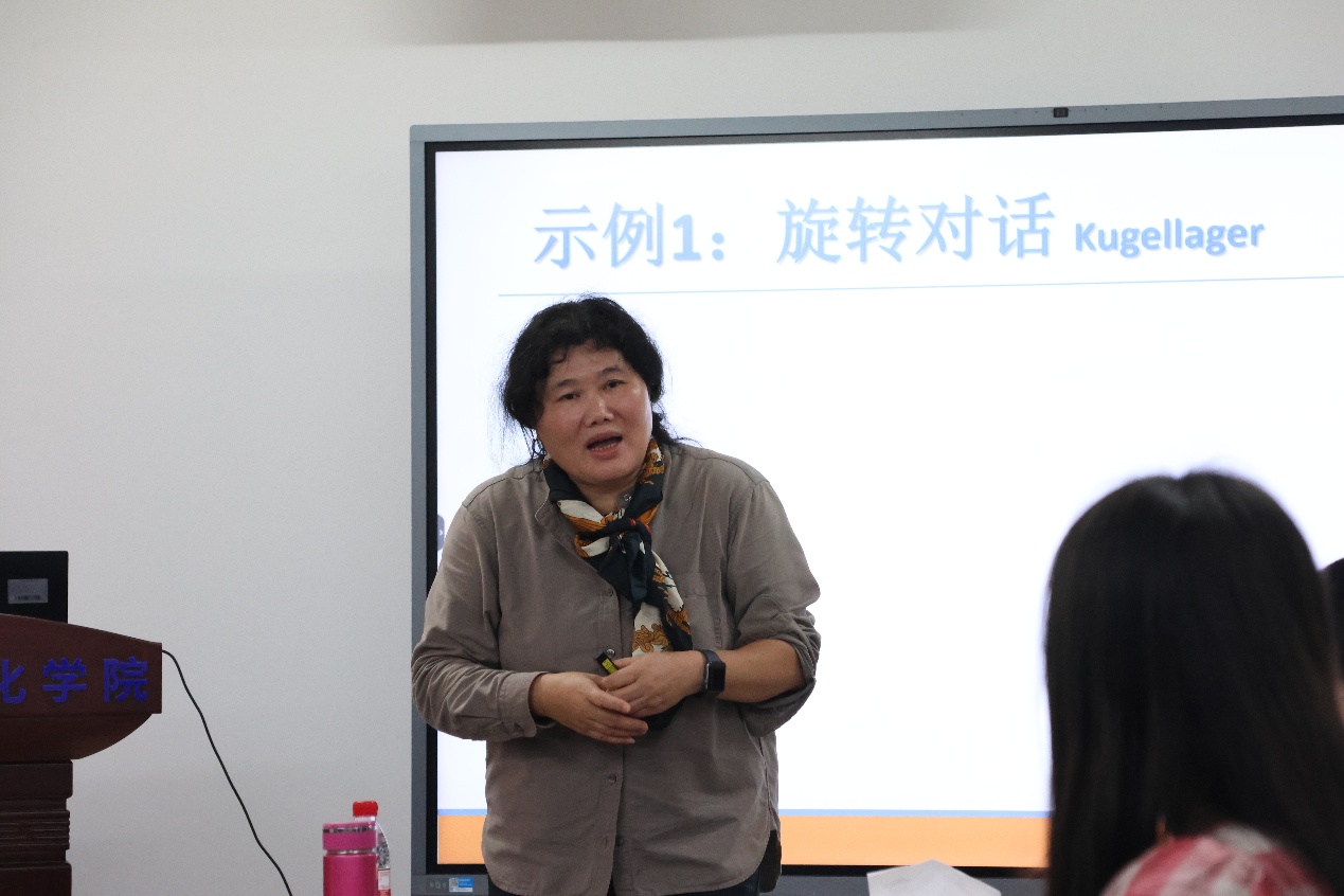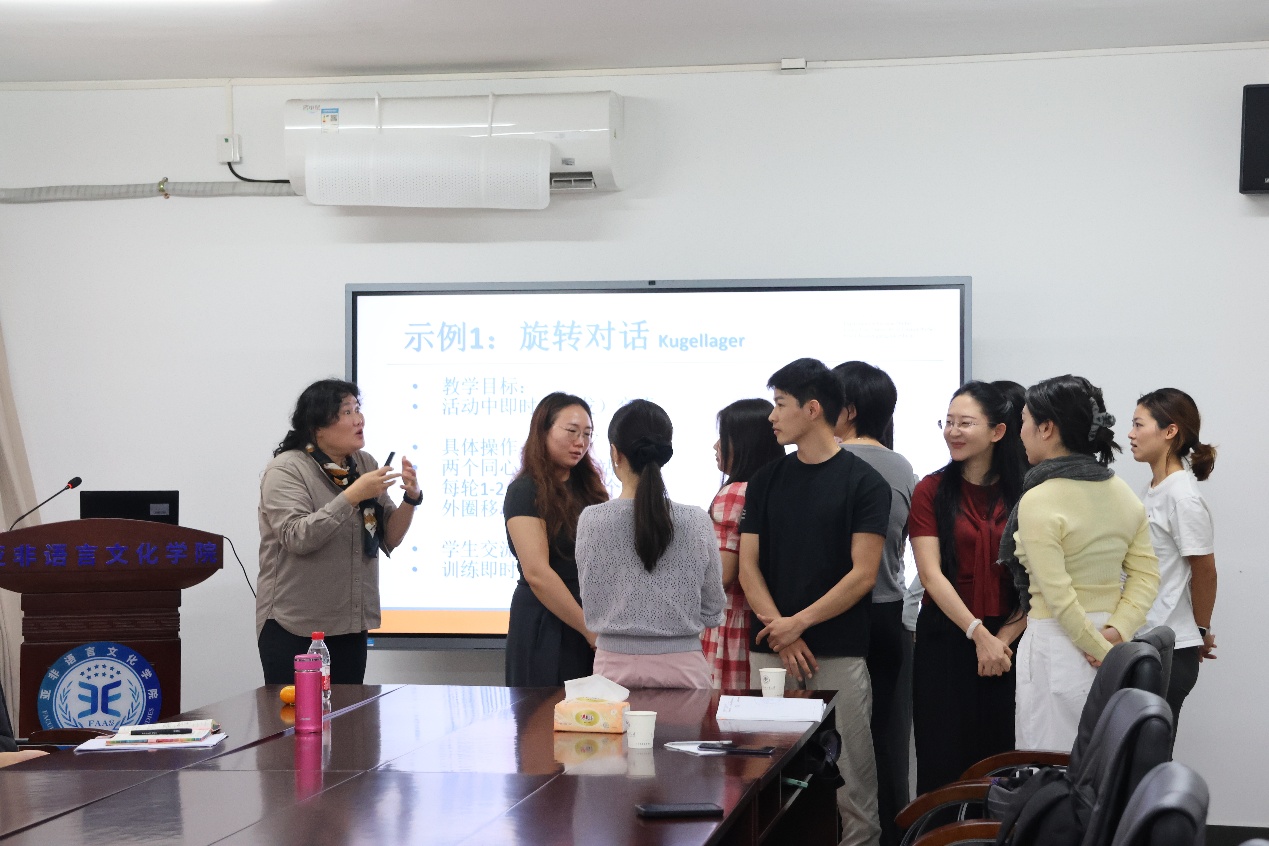 学院特邀广外德语系教学专家胡忠利老师进行专题分享。胡老师以《组织课堂活动,促进口语表达——如何让课堂更具互动和交流》为题,提出了口语教学的新范式。在介绍"旋转对话"、"快速约会"等创新教学方法时,胡老师特别邀请在场教师进行现场体验和演示, 现场教师们积极参与"旋转对话"等活动的模拟演练,在轻松愉快的氛围中亲身体验了以学习者为中心的教学理念。