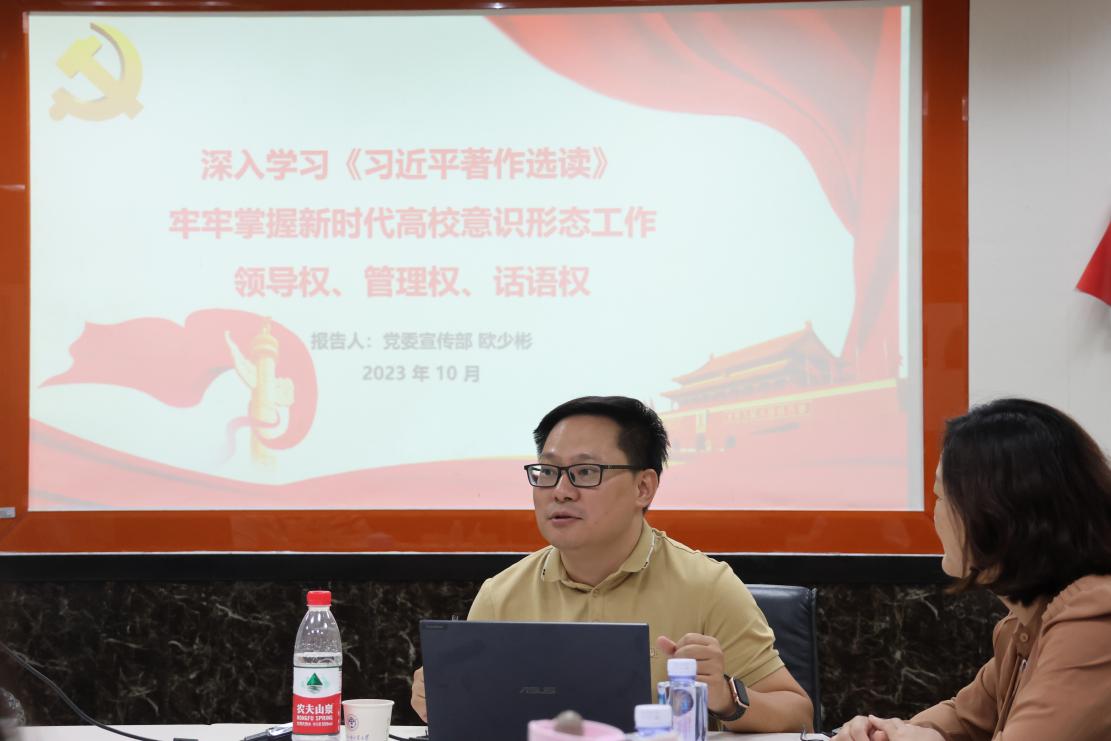 欧少彬从意识形态的概念入手,重点围绕习近平总书记关于意识形态工作的重要论述展开,全面回顾了习近平总书记关于意识形态工作的地位作用、根本原则、使命任务、基本要求、体制机制和主阵地主战场等方面做了详细讲解,生动列举了当前高校意识形态领域的主要风险点和主要错误思潮,提醒与会领导干部和老师们要引起高度重视。他强调,学院要落实落细意识形态工作责任制,分层分类抓好意识形态安全学习,建立健全工作机制,尽全力防患于未然。