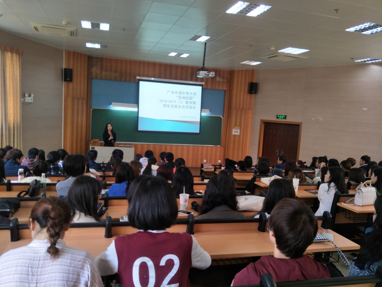 师生见面会由副院长杨晓辉主持,她介绍了我校“亚洲校园”计划的发展历程,该计划在教育部组织的评估中所取得的优异成绩及博得广泛社会美誉的情况。此外还就上学期工作进行了总结、对新学期工作进行了布置。她鼓励学生在新的一年要奋发图强,学有所成。各位任课老师也分别向学生介绍了自己所教课程的内容。