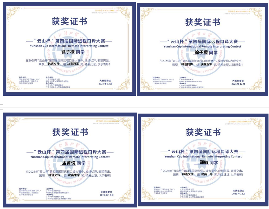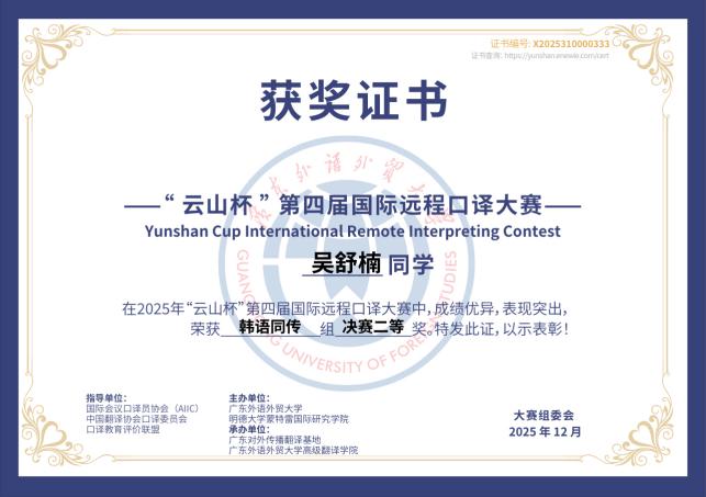 “云山杯”始终致力于探索人工智能时代翻译人才培养与跨文化传播新路径,积极服务国家对外战略需求,以语言科技赋能文明对话,为全球青年打造了一个深度理解中国、有效传递中国声音的高端平台。本次大赛的成功举办,不仅是远程口译技术应用与口译教育教学成果的一次集中检阅,更是推动翻译学科发展、服务国际传播能力建设的一次生动实践。朝鲜语专业也始终坚持以赛促学、以赛促译,通过组织学生参赛激发了青年学子投身于讲好中国故事、传播好中国声音的时代使命,为构建人类命运共同体贡献了宝贵的语言智慧与青春力量。