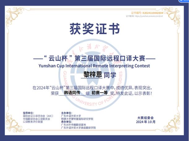 决赛汇聚了来自国内外高校的218名选手,以高水平的交替传译和同声传译技能,用16种外语向世界讲述中国故事、广东故事,进一步推动了中外文化的交流与民心的相通。经过激烈角逐,我院朝鲜语口译专业学生莫舒琦、李碧欣、黎梓恩以优异的表现脱颖而出,分别斩获第三届“云山杯”国际远程口译大赛交传组一等奖、交传组三等奖、同传组一等奖(未举办决赛,初赛即决赛)等奖项。