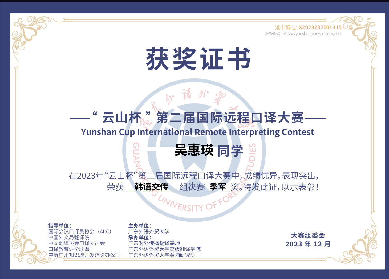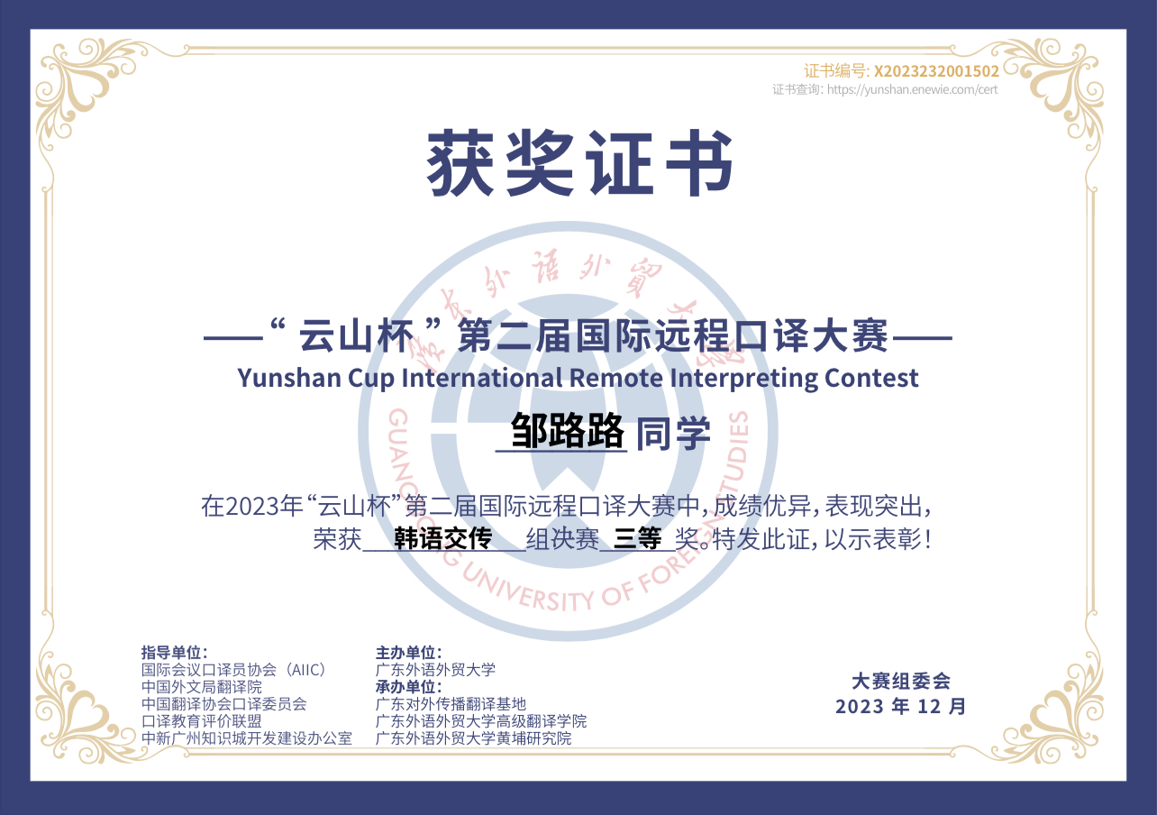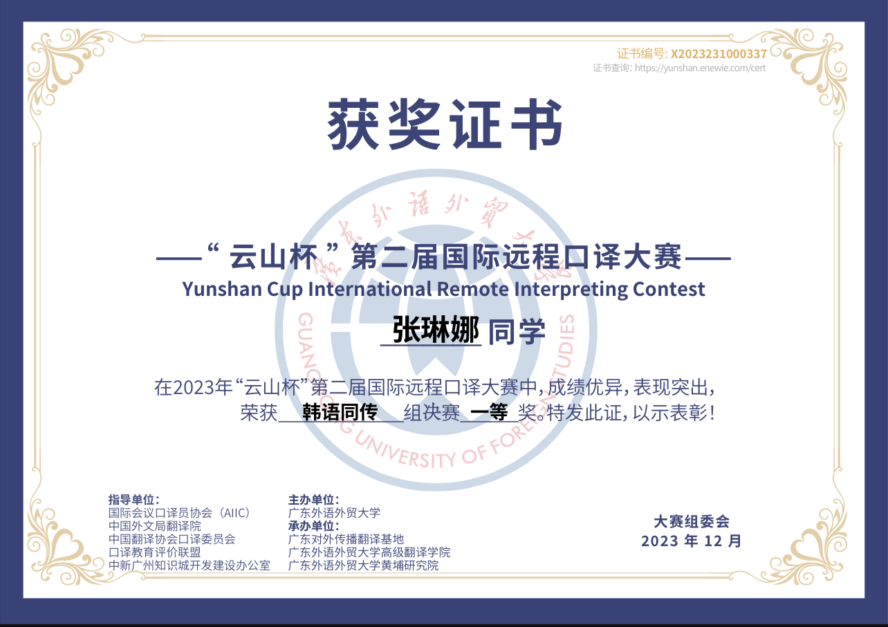 本次大赛由国际会议口译员协会(AIIC)、中国外文局翻译院、中国翻译协会口译委员会、口译教育评价联盟、中新广州知识城开发建设办公室指导,广东外语外贸大学主办,旨在培养一批能胜任各领域对外远程交流任务、擅长中译外国际传播的高素质翻译人才,推动语言服务行业创新发展,服务国家战略需求。几位获奖同学表示:“很荣幸决赛中斩获荣誉,这离不开学校、学院的培养以及朝鲜语口译专业老师们的严格要求和悉心指导,未来我们也会不忘初心,再接再厉。”