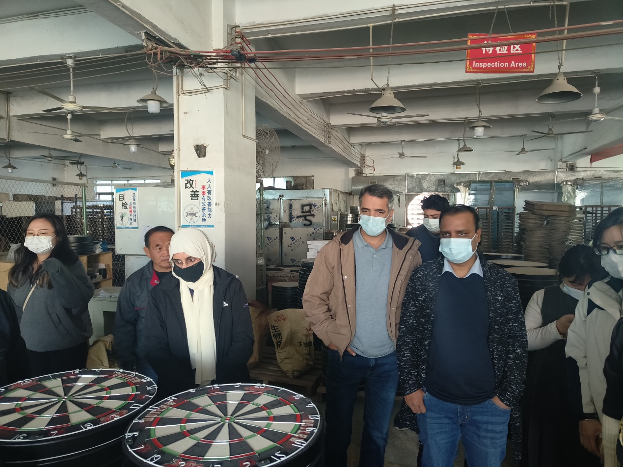 随后,教师们一行来到了惠州市创展运动器材有限公司其中一个工厂,依次参观了生产国际赛事级别飞镖盘的生产各流程的生产车间,与工厂工人进行交流,后又来到会议室了解了企业的发展历程、主营业务、主要产品等情况。这是一家在惠州扎根22年,通过自创的上下端打通的“一条龙“ 经营模式,同时经营海外公司和品牌零售的行业知名企业,核心产品为泳衣、水上运动设备、飞镖等,囊括了几乎所有的运动,在包括亚马逊在内的众多国内外知名电商平台上均有售卖,生产产值超5亿。作为广外惠州校友会会长的公司负责人李榕庆董事长在介绍中提到,为了响应2008年中国企业”走出去“政策和”一带一路“政策号召,也为了响应红色基地号召,创展公司先后前往赣州办厂,收购行业内小众品牌,把设计和研发带回中国,把营销留在海外,在德国、澳洲、加拿大、北欧都有业务涉及,97%的业务都为出口。因此他也期待能有更多优秀的广外学子能够加入他们,能够有更多的合作。