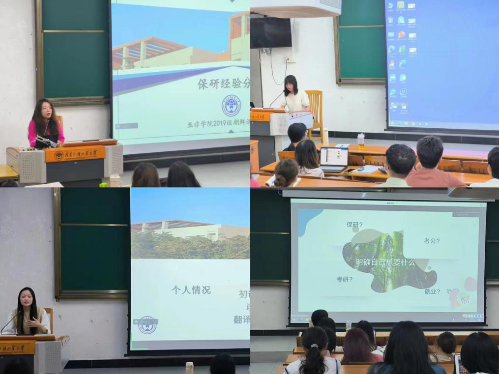 为营造良好的学习氛围,发挥榜样引领作用,促进优良学风建设,4月20日晚,亚非语言文化学院考研榜样专题榜样分享会在二教114室召开。此次活动由亚非学院辅导员蔡昊和王静菲主持,邀请亚非学院保研至复旦大学的董佩仪同学、考研至北京大学的王玺茜同学、考研至上海交通大学的唐思敏同学和考研至上海外国语大学的廖欢同学四位优秀学生同学代表分享经验,亚非学院线上线下共计70余名同学参与。
