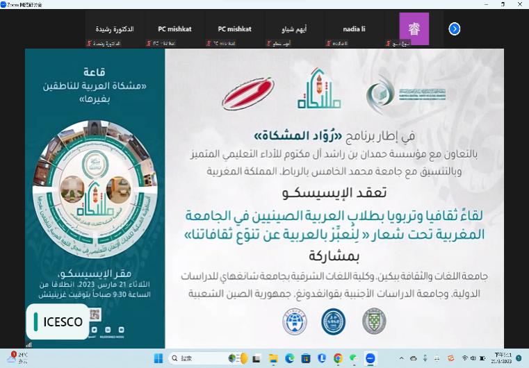 3月21日,应伊斯兰教科文组织(以下简称“ICESCO”)的邀请,我校亚非学院阿拉伯语系师生以视频连线的方式,集体参加了由ICESCO和摩洛哥穆罕默德五世大学共同举办的题为“用阿拉伯语讲述文明多样性”的座谈会。