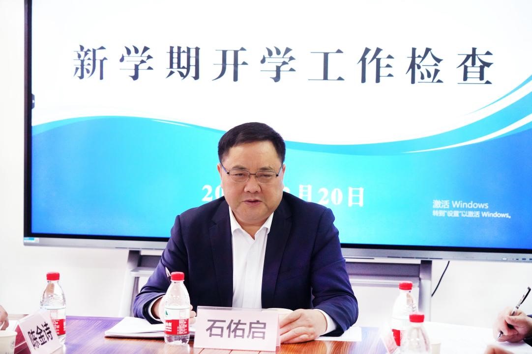 石佑启在听取学院的情况汇报后,充分肯定了新学院踏实肯干的工作作风,对学院新学期工作规划表示赞同,并对学院提出进一步工作部署和要求:一是明确目标,勇毅前行。要在明确方向的基础上迎难而上,攻坚克难;二是打好基础,凝聚活力。要凝聚共识,团结齐心谋求长远发展;三是问题导向,破解难题。要提升教师教研能力,落实立德树人根本任务;四是做好宣传,扩大影响,要做好招生宣传,将学院发展与服务国家战略紧密结合,推动学院开好局、行致远,促进学院高质量发展。