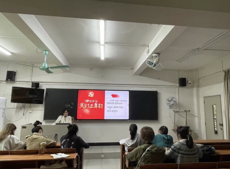10月,孟加拉语专业教师鹿梦琪开展特色课堂教学活动,将爱国主义教育寓教于乐,带领学生学习孟加拉语版的党史知识,并学唱孟加拉国爱国主义歌曲。学生们学习专业语言技能的同时,还深入理解了以爱国主义为核心的民族精神,受益匪浅。
