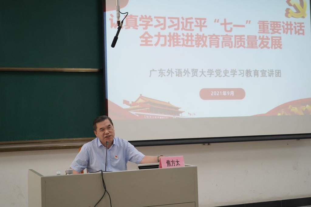 为深入学习贯彻习近平总书记“七一”重要讲话精神,推动党史学习教育深入开展,9月16日下午,学校党委常委、副校长焦方太为日语学院、亚非学院(筹)师生开展习近平总书记“七一”重要讲话精神专题辅导,学院全体教职工和学生党员代表120余人参加。专题辅导在北校二教219室举行。