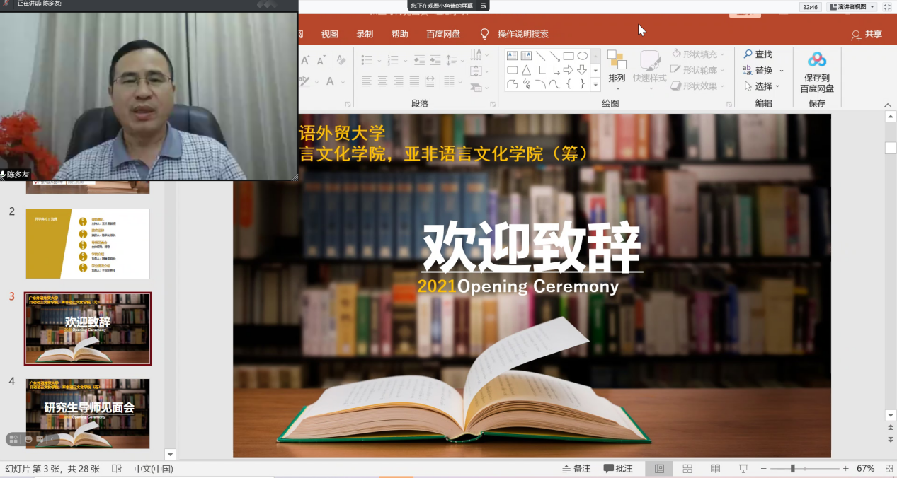 院长陈多友教授首先对2021级研究生新生的加入表示欢迎,希望新生们把日语、亚非学院当做自己的家。同时在疫情防控常态下,陈院长也对同学们的防疫意识提出了要求,叮嘱同学们在忙于学业的同时,要多关注自己的健康情况。