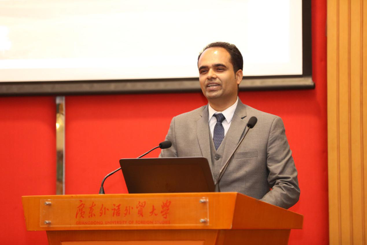 2019年12月20日,广东外语外贸大学2019年度外教工作总结会在北校行政楼国际会议厅召开。副校长焦方太在会上致辞,全校外籍教师、各学院主管外事工作的负责人和国际合作与交流处、港澳台事务办公室全体人员参加会议。我院印地语专业外教智辉(Vivek Mani Tripathi)作为全校的4名外教代表之一,分享了自己与广外共同成长的精彩故事。