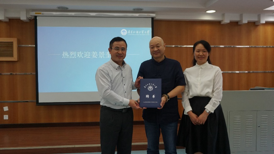 本网讯 11月8日下午,我院在北校区隆重举行了“云山工作室”首席专家聘书颁发仪式。院长陈多友教授和学院党委书记周秀娇代表学校共同为姜景奎教授颁发了广东外语外贸大学“外国语言文学学科云山工作室”首席专家聘书。