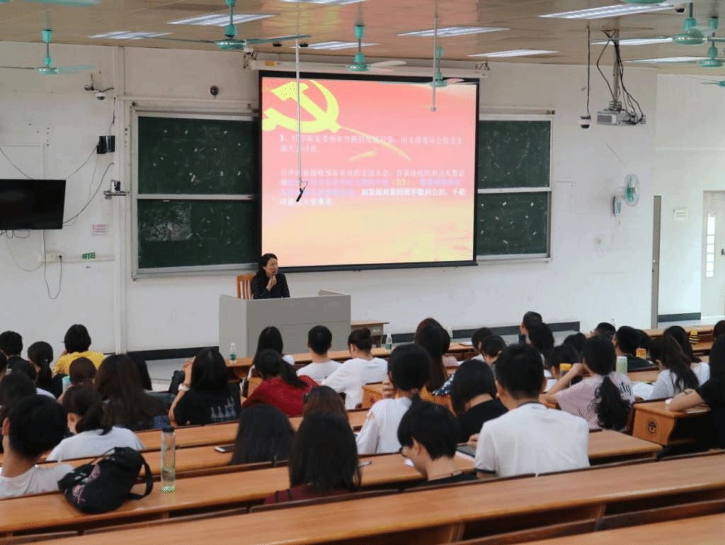 本网讯 为进一步贯彻落实全面从严治党的精神,严格规范学院发展党员工作,提高党员素质,保持党的先进性和纯洁性,学院党委于4月11日下午在二教219课室开展党务工作培训。此次培训由日语学院、亚非学院(筹)党委书记周秀娇主讲,学院党委副书记曾智鹏、部分教师党支部书记、各年级辅导员、全体学生党员、本学期党校师生发展对象和入党积极分子参加。培训会由曾智鹏副书记主持。