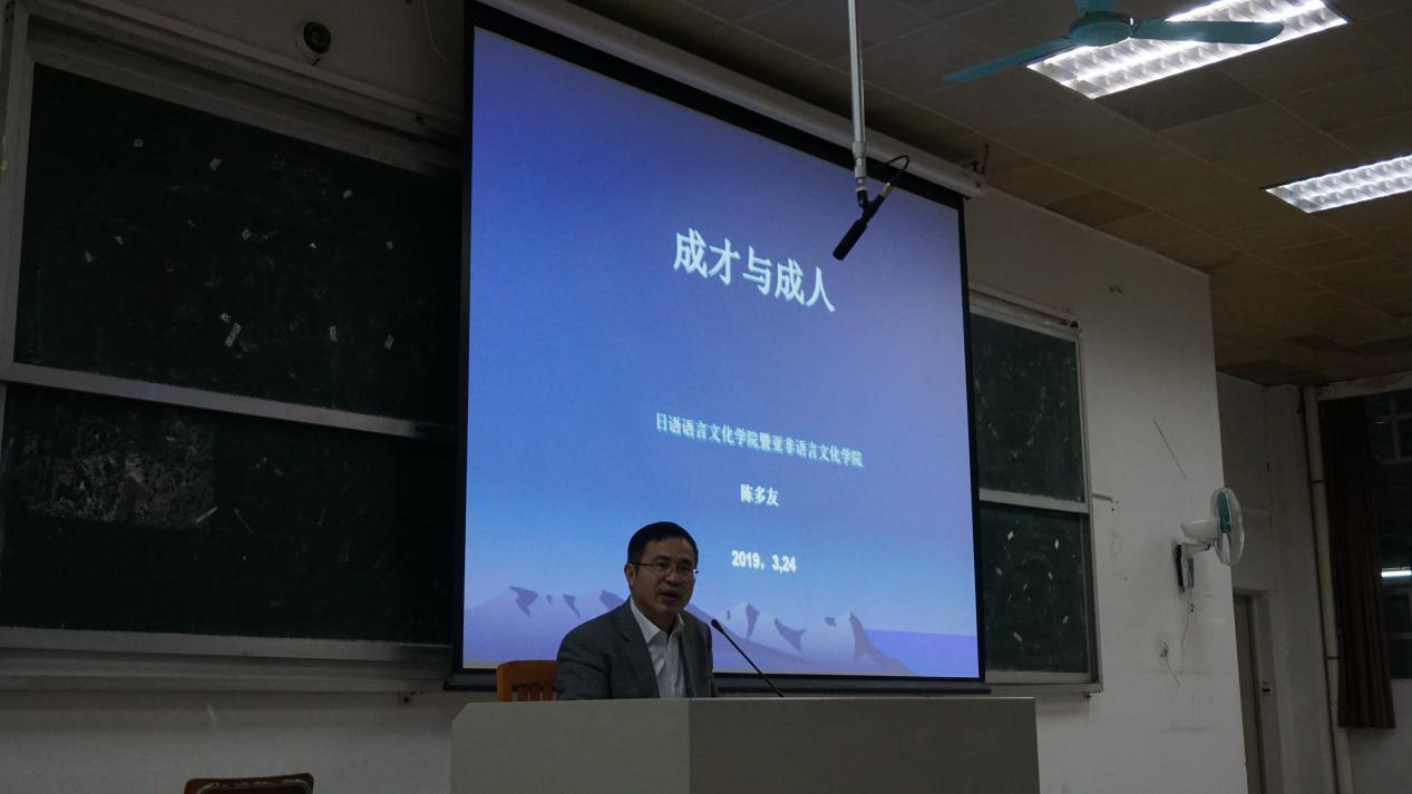 本网讯 3月24日,日语学院、亚非学院(筹)书记院长思政课在北校第二教学楼举行,日语学院、亚非学院(筹)党委书记周秀娇、院长陈多友走进本科生课堂,为我院2017级和2018级本科生讲授新学期第一堂思想政治理论课。