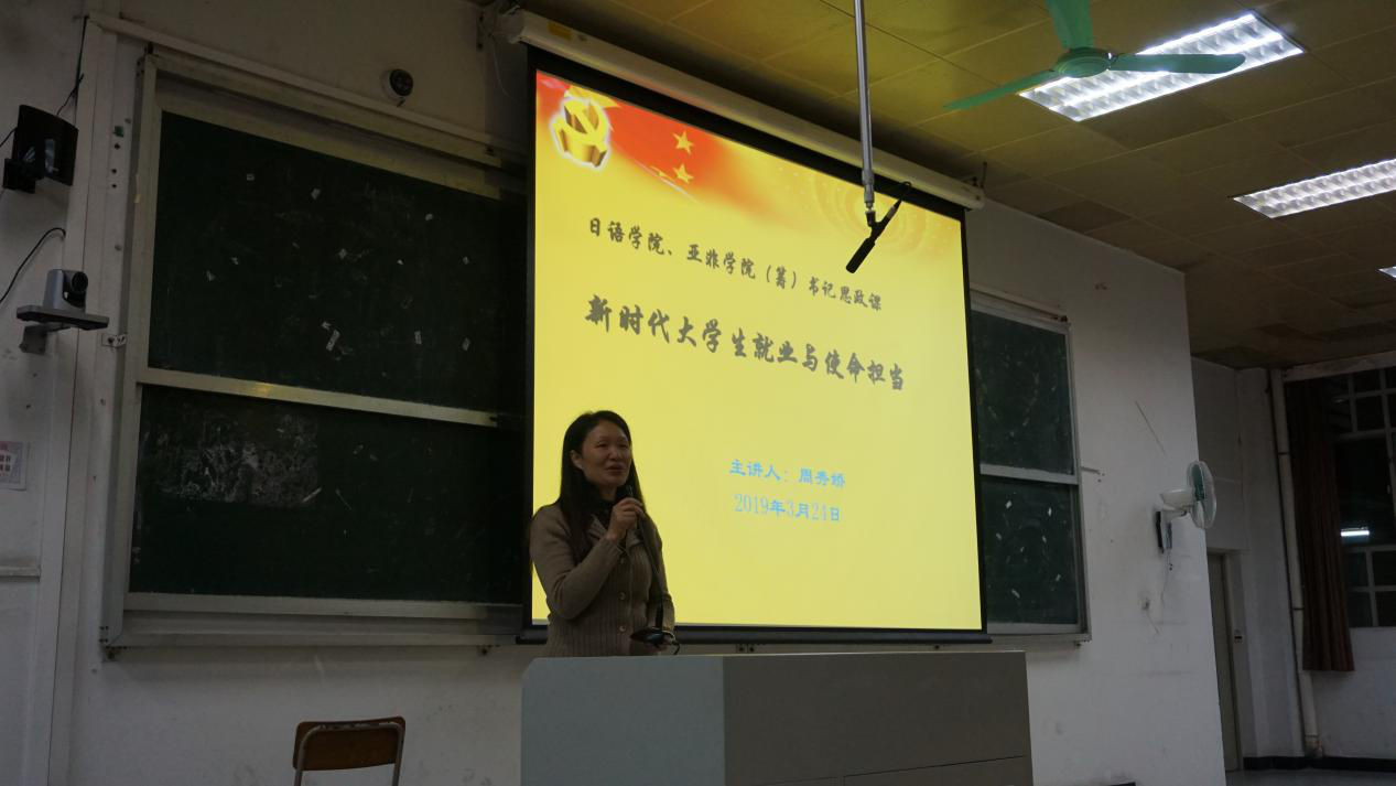 周秀娇书记以“新时代大学生就业与使命担当”为主题,从“新时代、新征程”、“大学生就业”、“勇担历史重任”三个方面出发,指出当代大学生处于国家建设的新征程中,是新时代国家建设新征程中的骨干力量。她结合国家“一带一路”倡议以及粤港澳大湾区发展规划纲要,分析了外语人才所面临的发展机遇和挑战,寄语当代大学生在新时代国家建设中要增强使命担当,坚定理想信念;努力学习,掌握本领;自觉把个人理想融入国家和民族的伟大事业中,勇担重任,建功立业新时代。