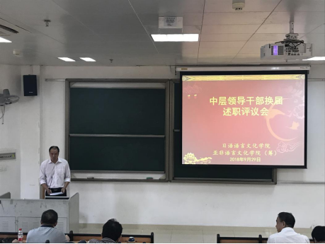 曾智鹏副书记首先进行干部述职,他对自己在原东语语言文化学院及日语语言文化学院、亚非语言文化学院的各项工作进行了总结,并从德、能、勤、绩、廉五个方面谈到了自己在学生工作方面取得的成果及存在的不足。康为茂书记接着进行工作述职,他首先表示对于加入日语语言文化学院、亚非语言文化学院(筹)这个团结、和谐的大家庭感到十分开心,并表示如能继续留在学院,将会不遗余力继续在岗位上为学院谋福祉,做到“定好位,站好台,做好事”。