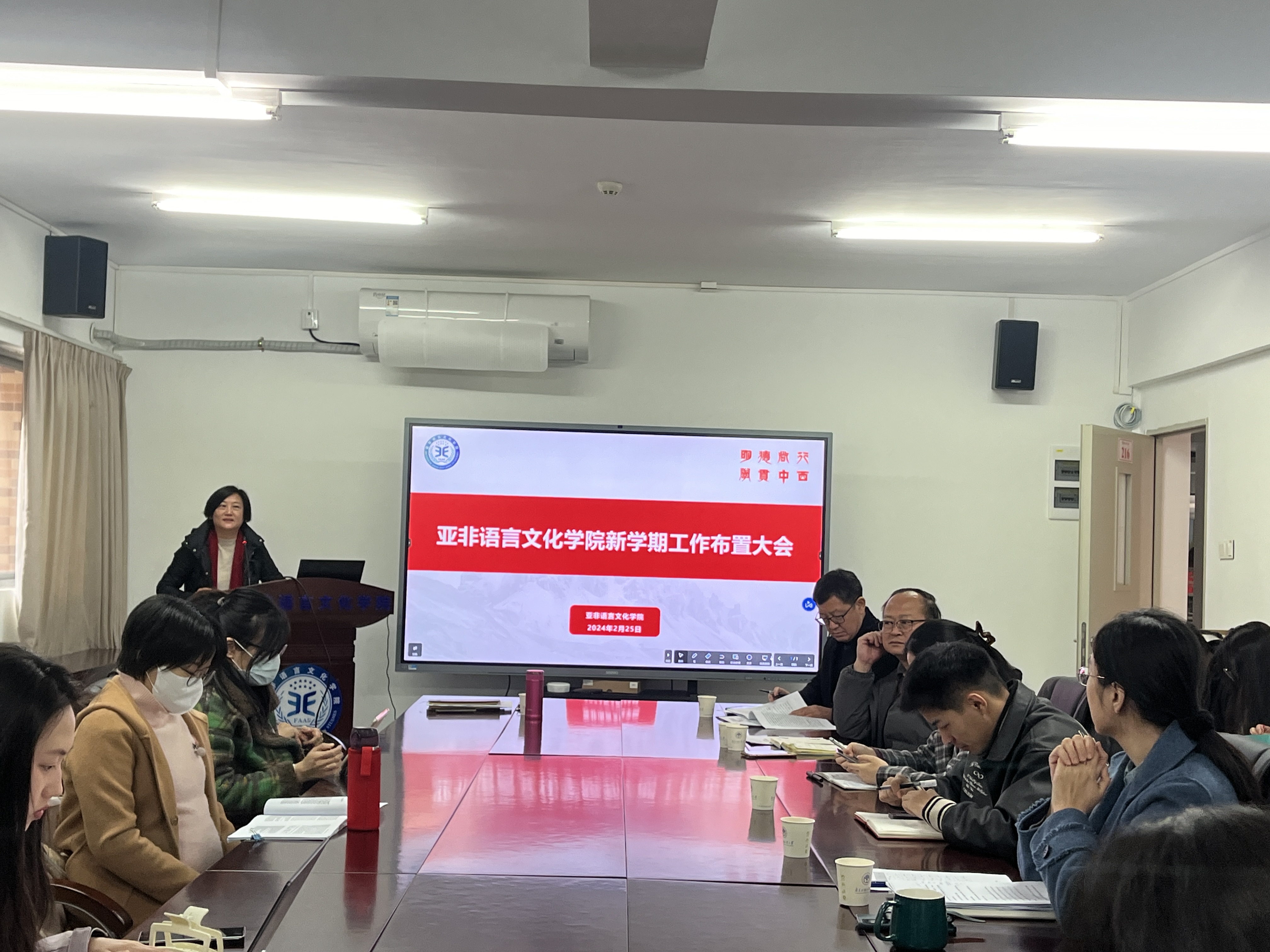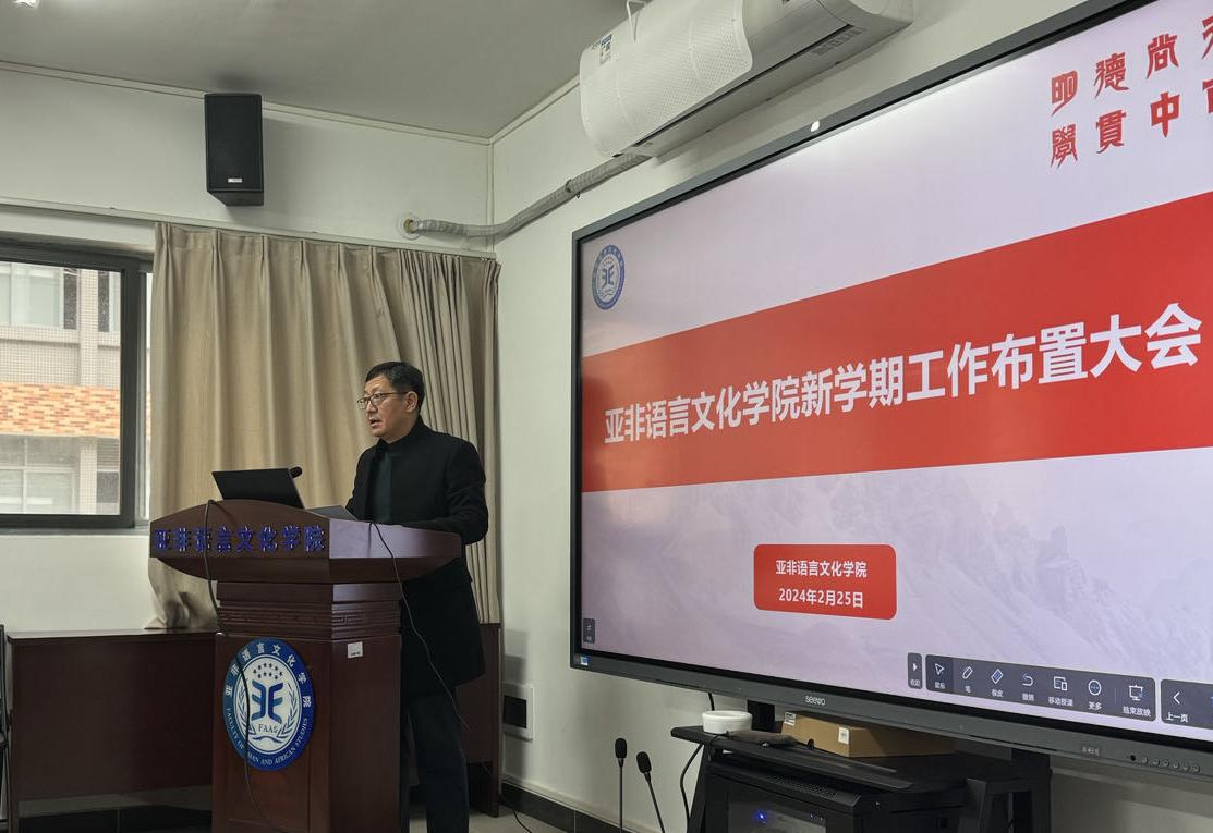 2024年2月25日上午,亚非学院在第一教学楼北楼216召开新学期工作布置大会。学院领导班子成员和全体教职工参加会议,会议由学院党委书记梁洁主持。