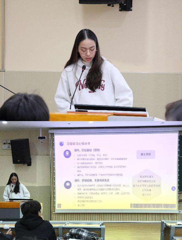 分享会在热烈的氛围中拉开帷幕,印地语专业的范家菀同学率先进行分享,她围绕日常学习生活、外交部报考准备及心理调适等方面展开,并着重强调平日夯实知识基础与针对性备考的关键作用。
