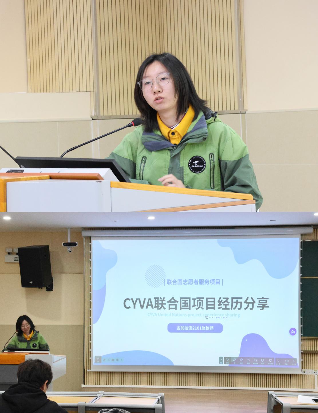 随后,孟加拉语赵怡然同学带来国际组织的实习经历分享。她深入介绍了实习项目CYVA(中国青年志愿者海外服务计划),包括她的工作内容与报考经验,并为同学们提供了丰富的国际组织实习的信息资源,鼓励同学们积极投身国际志愿者事业,在国际舞台上展现亚非学子的卓越风采与青春担当。