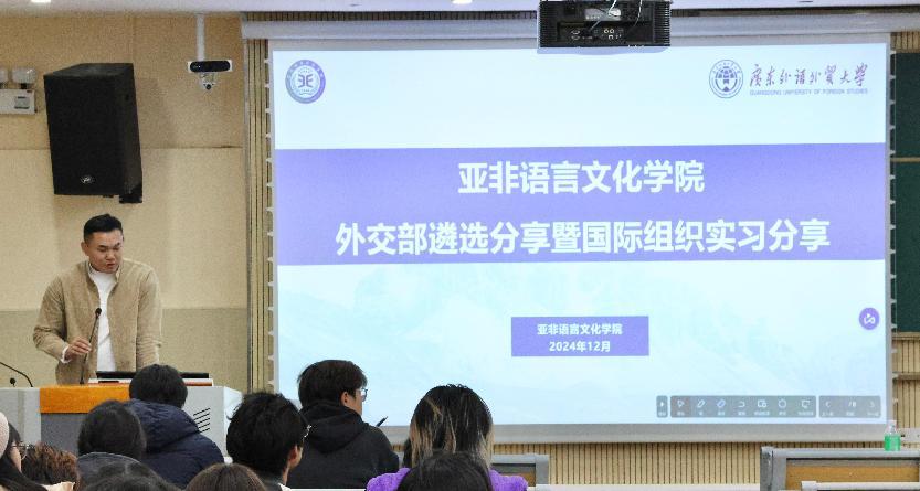 本网讯 12月19日晚,亚非语言文化学院在白云山校区一教109教室举行外交部遴选和国际组织实习分享会。此次活动由学院辅导员蔡昊主持,邀请学院22级成功通过外交部遴选的范家菀和王俊祥同学,以及在联合国志愿组织实习的21级赵怡然同学分享经验,亚非学院22、23、24级同学共同参加活动。