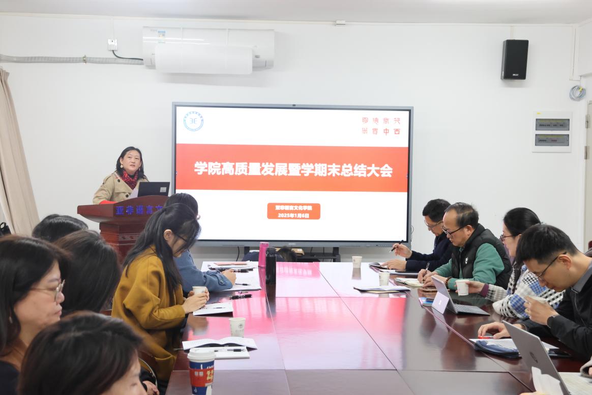 2025 年 1 月 10 日,亚非学院在学院会议室召开高质量发展暨期末总结大会,全院教职工齐聚一堂,共同回顾本学期工作成果,展望未来发展方向。会议由党委书记梁洁主持。
