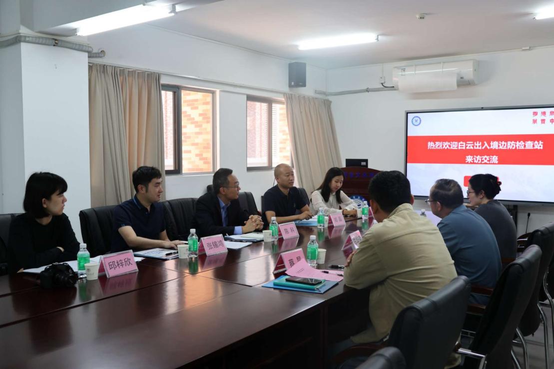 本网讯 为强化实践型小语种人才培养、共探校警合作新路径,3月26日下午,广州白云出入境边防检查站(以下简称“白云边检站”)办公室主任陈科一行赴广东外语外贸大学亚非文化学院开展走访交流活动,亚非学院党委副书记陈华荣、副院长牛子牧以及辅导员蔡昊参加座谈交流。
