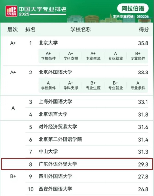 2025年6月18日,高等教育专业评价机构软科正式发布“2025软科中国大学专业排名”*,广外亚非语言文化学院(简称“亚非学院”)的10个本科专业中,朝鲜语专业跃居全国第3,印地语位列全国第4,阿拉伯语位居全国第8。不仅彰显了广外亚非学院在非通用语教学与研究方面的卓越实力,同时也体现了亚非学院在积极推进教学改革与创新方面的显著成果。