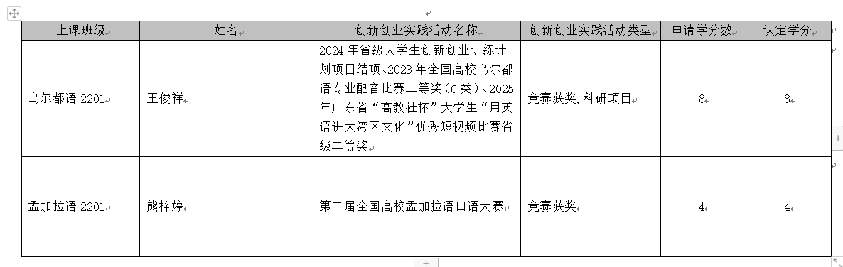 经个人申请和学院教指委审核,现将亚非学院2025-2026学年度本科生创新创业学分申请与认定情况和材料进行公示,公示期为11月5日-11月9日,在此期间如有异议请将意见和反馈实名发送至202320089@gdufs.edu.cn王老师,反映情况要求实事求是,不得借此诽谤抹黑或人身攻击。